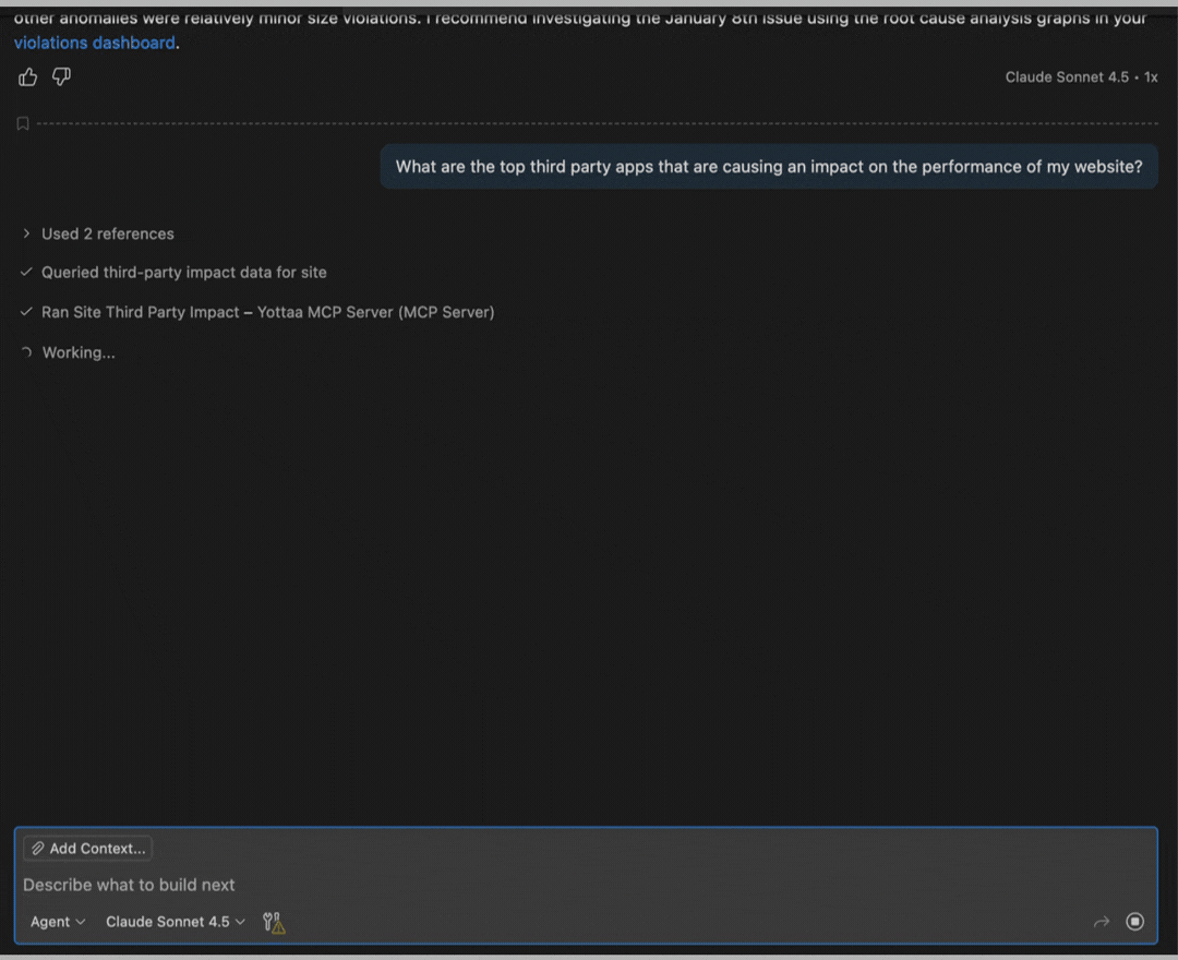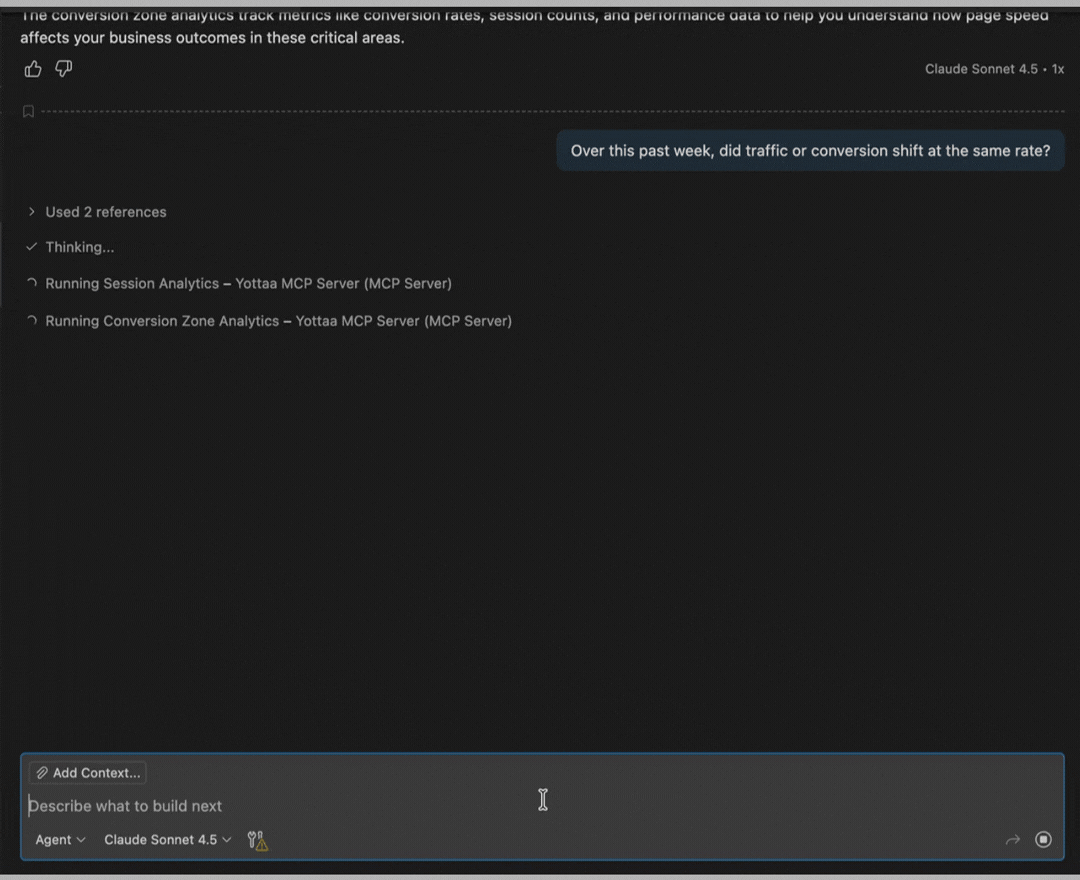 Today, the Yottaa MCP Server provides an initial set of purpose-built performance and conversion diagnostics, giving teams a lightweight but powerful way to query real user data via AI and investigate issues with confidence. It is purpose-built for developer workflows, supporting natural language queries from AI clients like Claude, Cursor, and VS Code extensions, with structured responses AI agents can reason over.