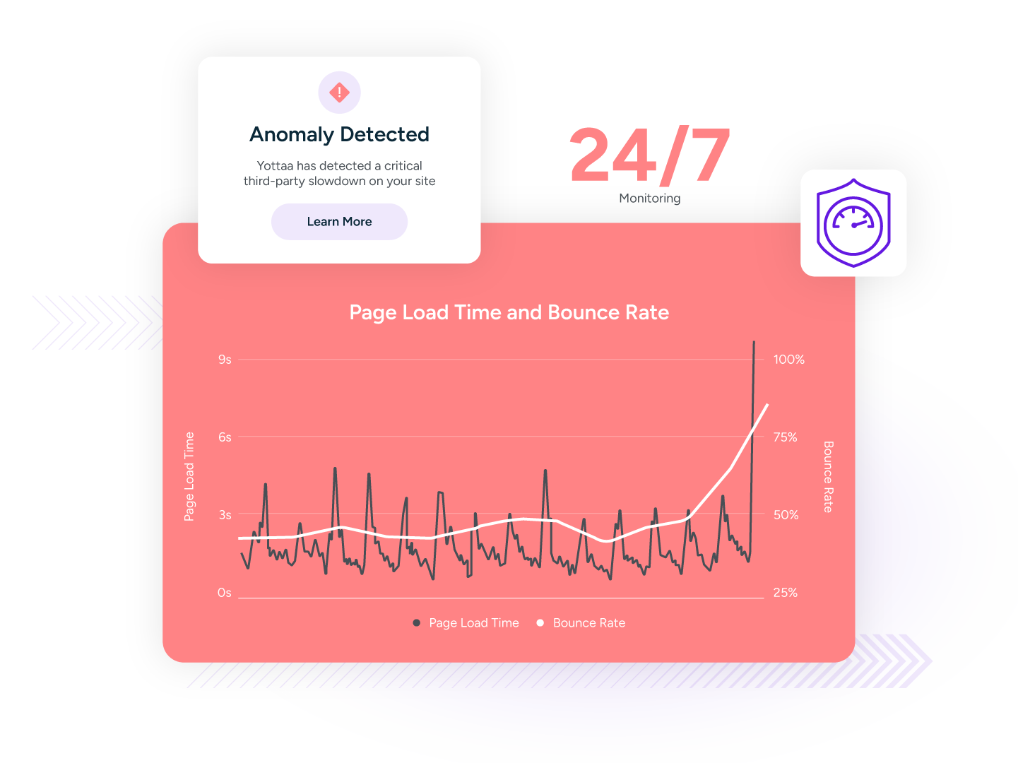 With Hybrid Real User Monitoring across every browser and device, anomaly detection, and Fastly observability at the edge, Yottaa flags outages, slowdowns, and security risks before they escalate. Always-on monitoring gives you the visibility needed to spot performance dips and safeguard conversions.